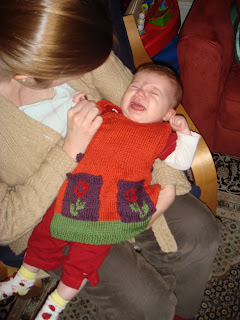 I hoped that when I finally put this little pinafore on her, she'd smile and we'd have a lovely photo of Audrey in something knitted for her. But it was not to be. Instead, she started to cry and arch her back at the same time-- her way of saying that if I didn't get her out of that pinafore, I'd be sorry...
